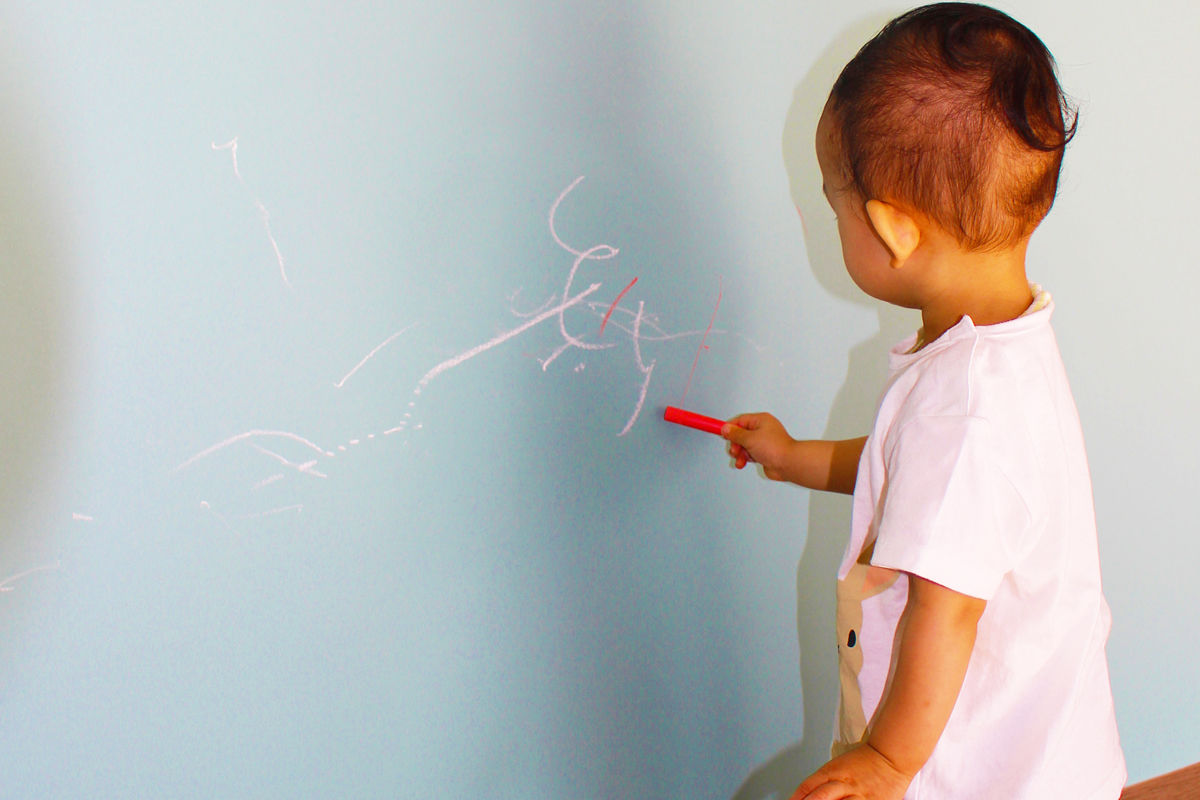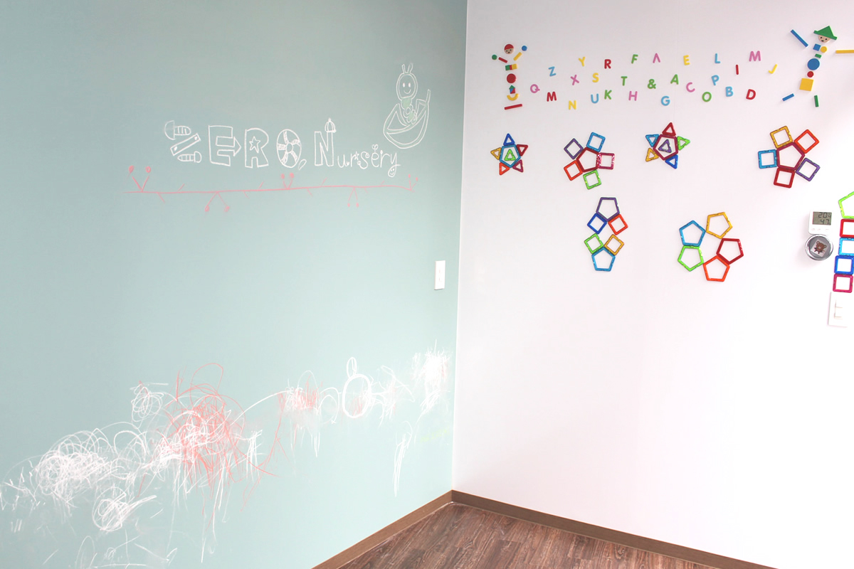 北欧インテリアを基調とした園内。メインカラーは自由な発想を育む心理的効果があるとされる青緑色を使用。お絵かきや磁石遊びができる壁は子どもたちから大人気です。